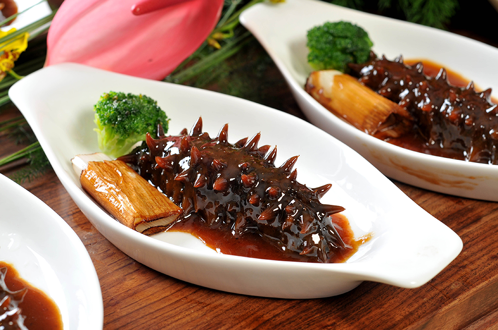 3.原汁勾芡,淋明油,澆在海參及大蔥上即可。