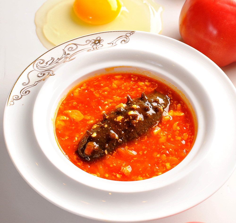 3.凈鍋上火,加油燒熱,下蔥、姜爆鍋,倒入番茄片和番茄沙司炒至紅色,加上湯,調入鹽、味精、雞粉,放入海參,打入雞蛋,煮至開鍋即可。