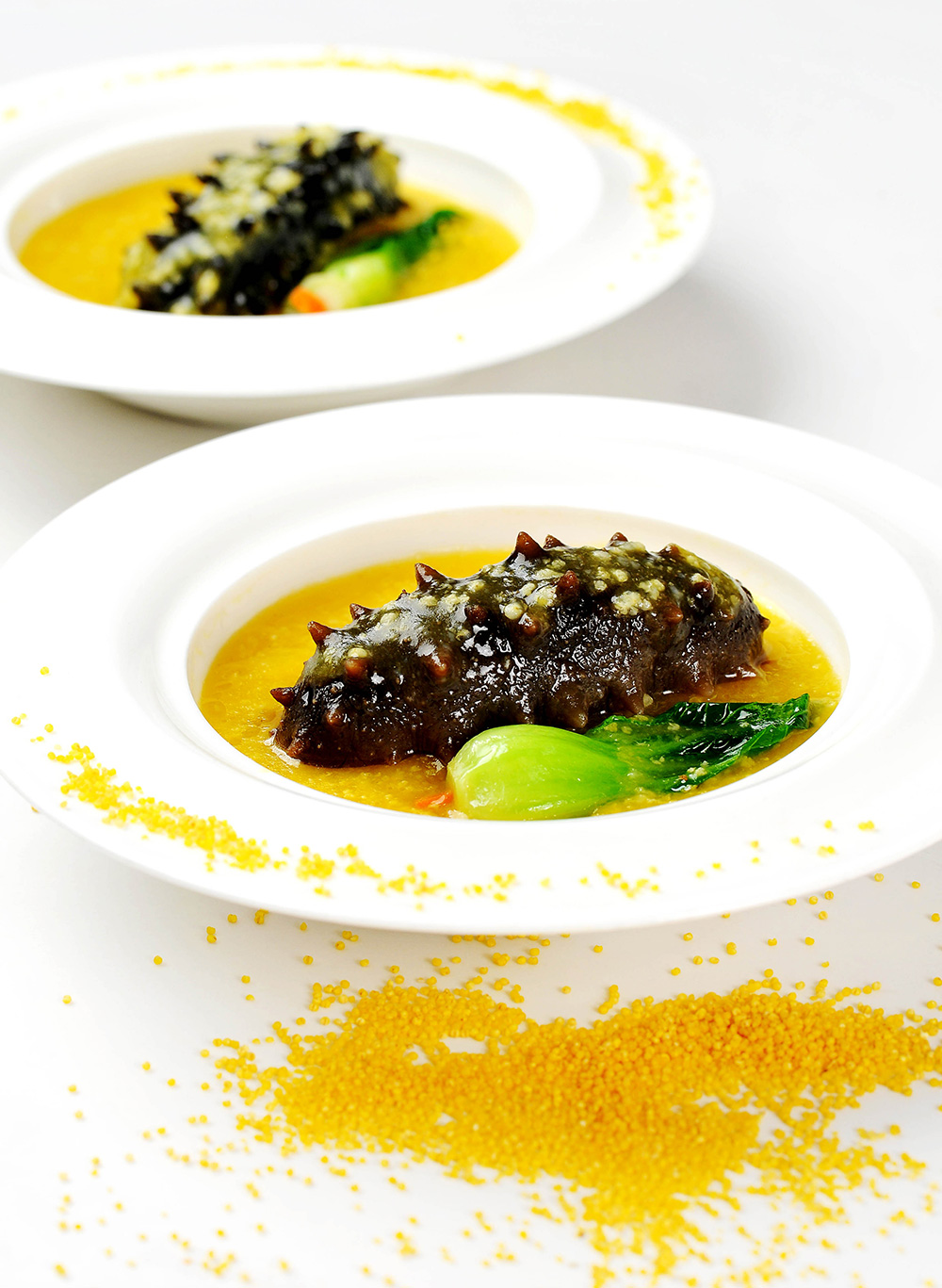 2.把發好的海參用上湯煨制入味,放入盤中,澆入煲好的米湯即可。