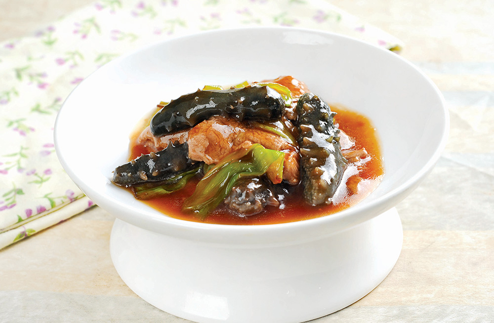 2.牛肉取出切片放入大碗中,加入海參、醬油、料酒、鹽、大料以及剩下的蔥姜和少量煮牛肉的湯汁,旺火蒸20分鐘;