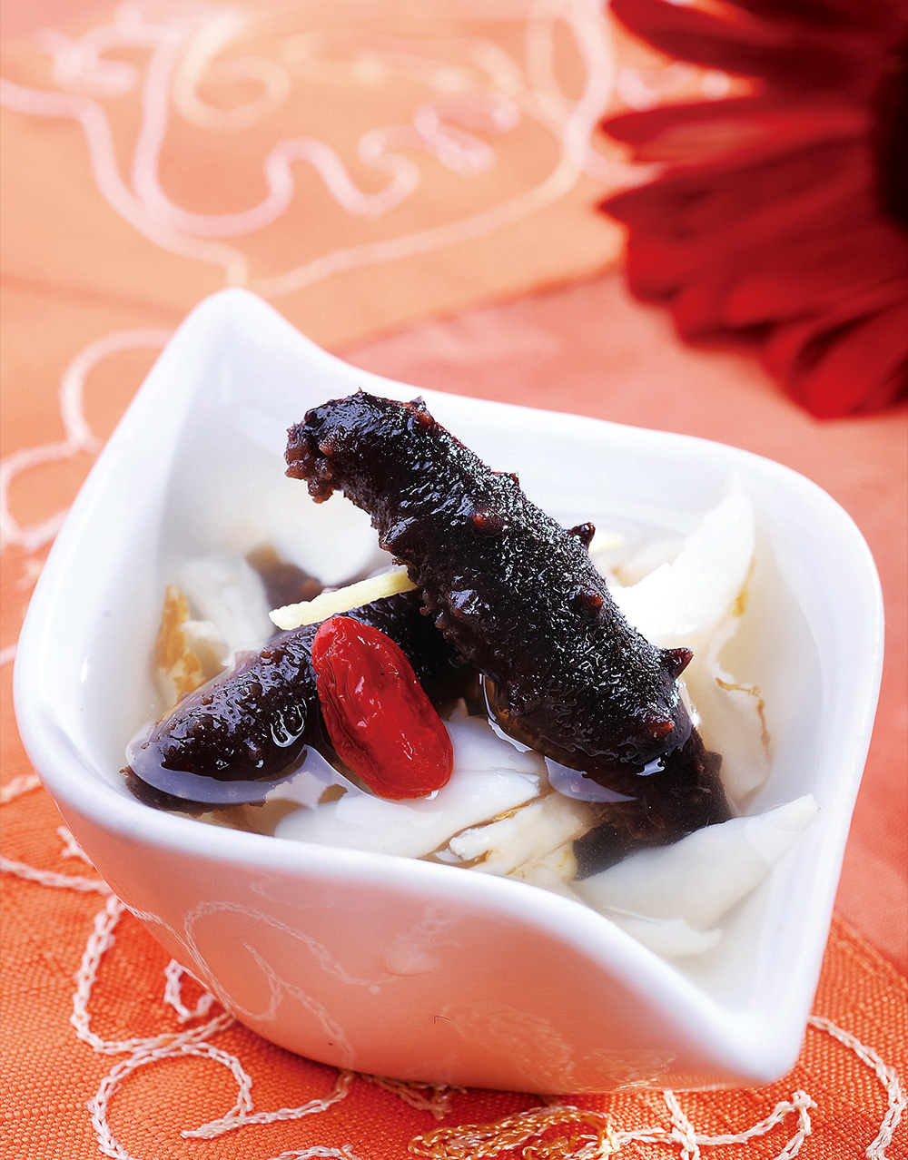 3.鍋上火倒入高湯,下入海參、當歸煲至即熟時加入枸杞,調鹽。