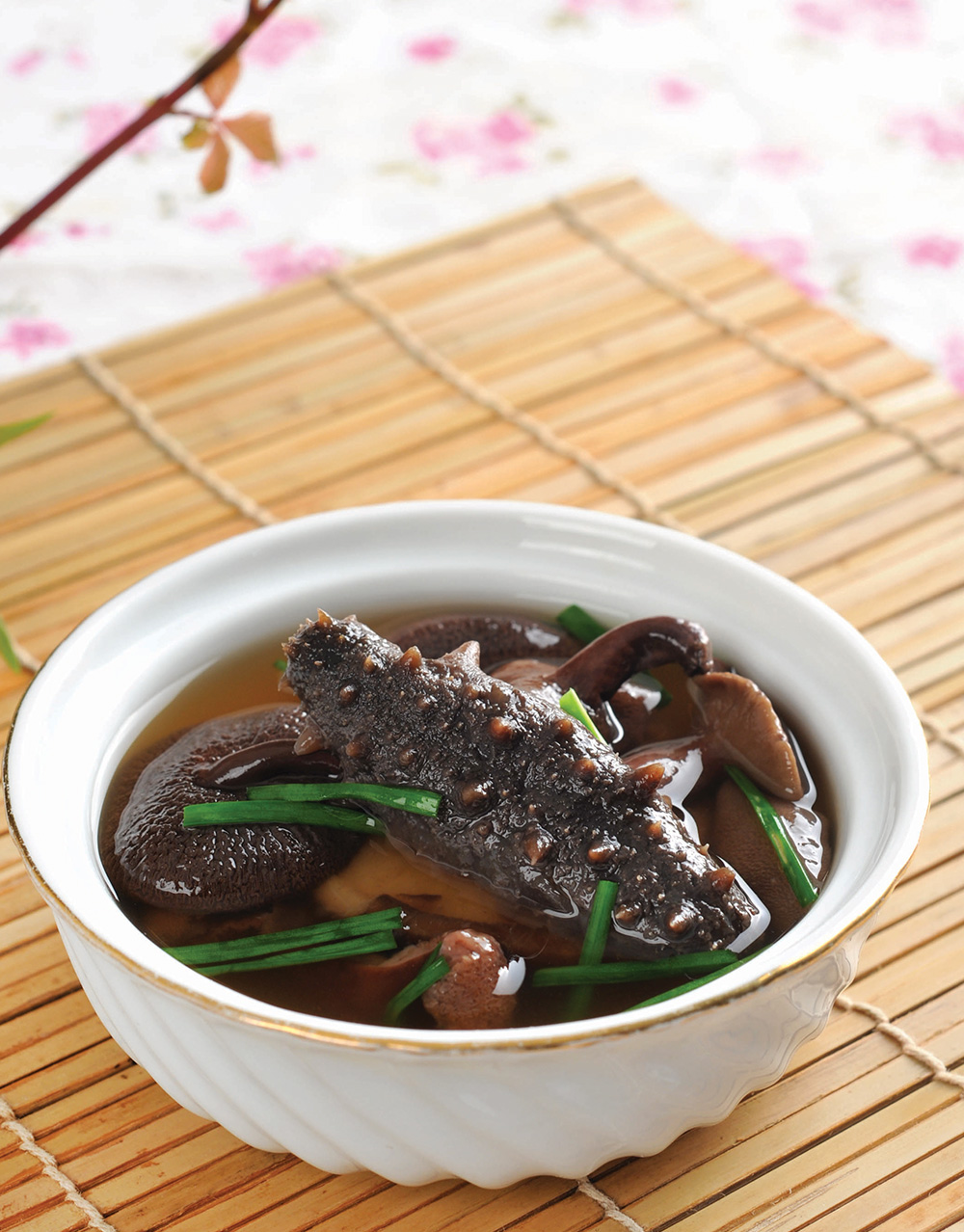 3.另起鍋,放入高湯,投入海參及各種配料,放入鹽、雞汁、味精、胡椒粉燒開,撇去浮沫,撒上香蔥即可。